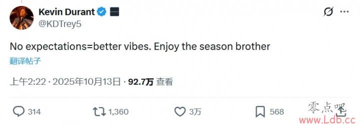 杜兰特回复道:“没有期待=更好的氛围。享受这个赛季吧兄弟。”