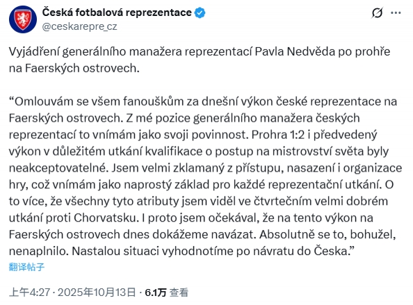 此役失利后,捷克国家队官推发布了捷克国家队总经理内德维德的致歉声明。
