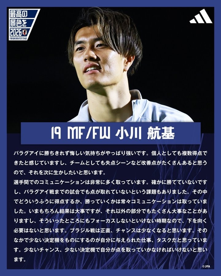 小川航基表示:“与巴拉圭的比赛没能取胜,这果然还是让我觉得很不甘心,虽然我在国家队的进球数上了双,但从球队整体角度来看,包括丢球等多方面都还需要改善,希望接下来的比赛中我们能加以改进。”