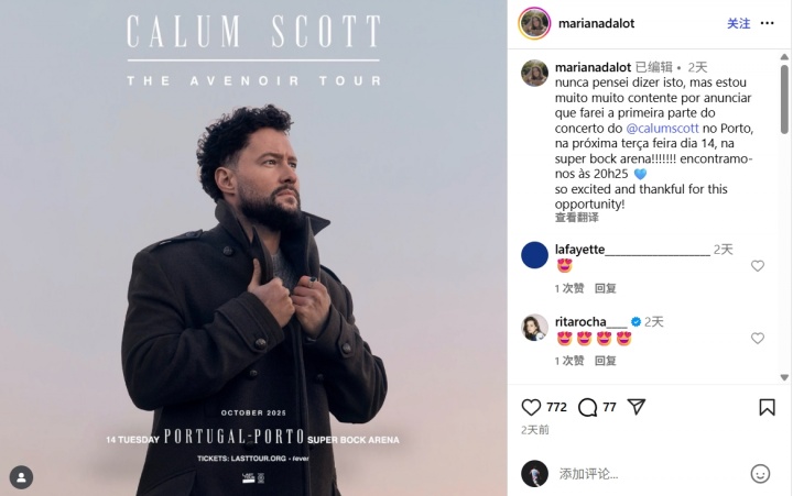 玛丽安娜-达洛特在社交媒体上写道:“我从未想过自己会说出这句话,但我非常高兴地宣布,我将在下周二,10月14日,于波尔图的超级波克竞技场为卡尔姆-斯科特(Calum Scott)的演唱会担任开场嘉宾!我们晚上8点25分见,我对此机会感到无比兴奋和感激。”