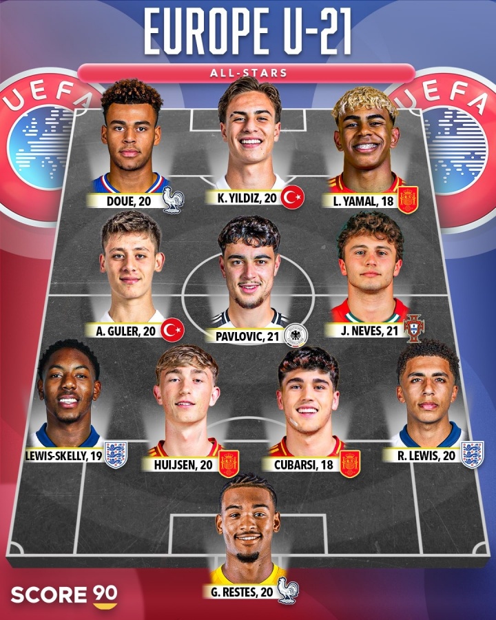 零点吧足球10月13日讯 Score 90评选了欧洲U21年龄段的全明星阵容,亚马尔、若昂-内维斯领衔,其中西班牙三人,土耳其、法国、英格兰各两人,葡萄牙、德国各一人。