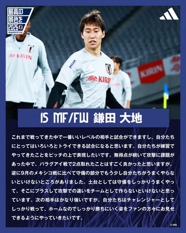 镰田大地表示:“接下来与巴西队的比赛,是我们近期交手的对手中水平最高的,对我们来说,这场比赛有很多想要尝试的方面,希望能够在比赛中将我们训练中的表现展现出来。此前难攻破对手大门一直是我们需改善的一大课题,不过在与巴拉圭的比赛中有所改观,打进了2球,但比起9月份与墨西哥队的比赛,我们在防守端必须要做得更好。”