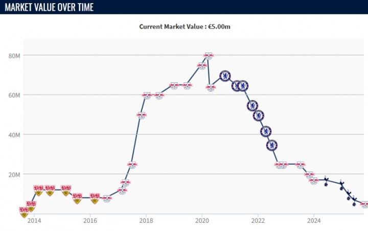 29岁的维尔纳在2020年以5300万欧元转会费加盟切尔西,也是在2020年,球员巅峰身价一度达到8000万欧元,但如今维尔纳身价已经跌至500万欧,他与莱比锡的合同将于明夏到期。