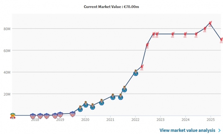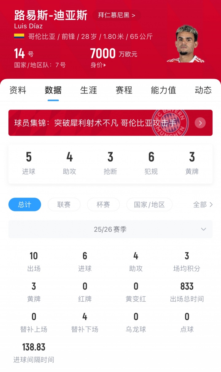 迪亚斯的巅峰身价为2024年的8500万欧,今年五月底,迪亚斯的身价从8500万下跌至7000万。在拜仁的完美开局并没能帮助他的身价回调。