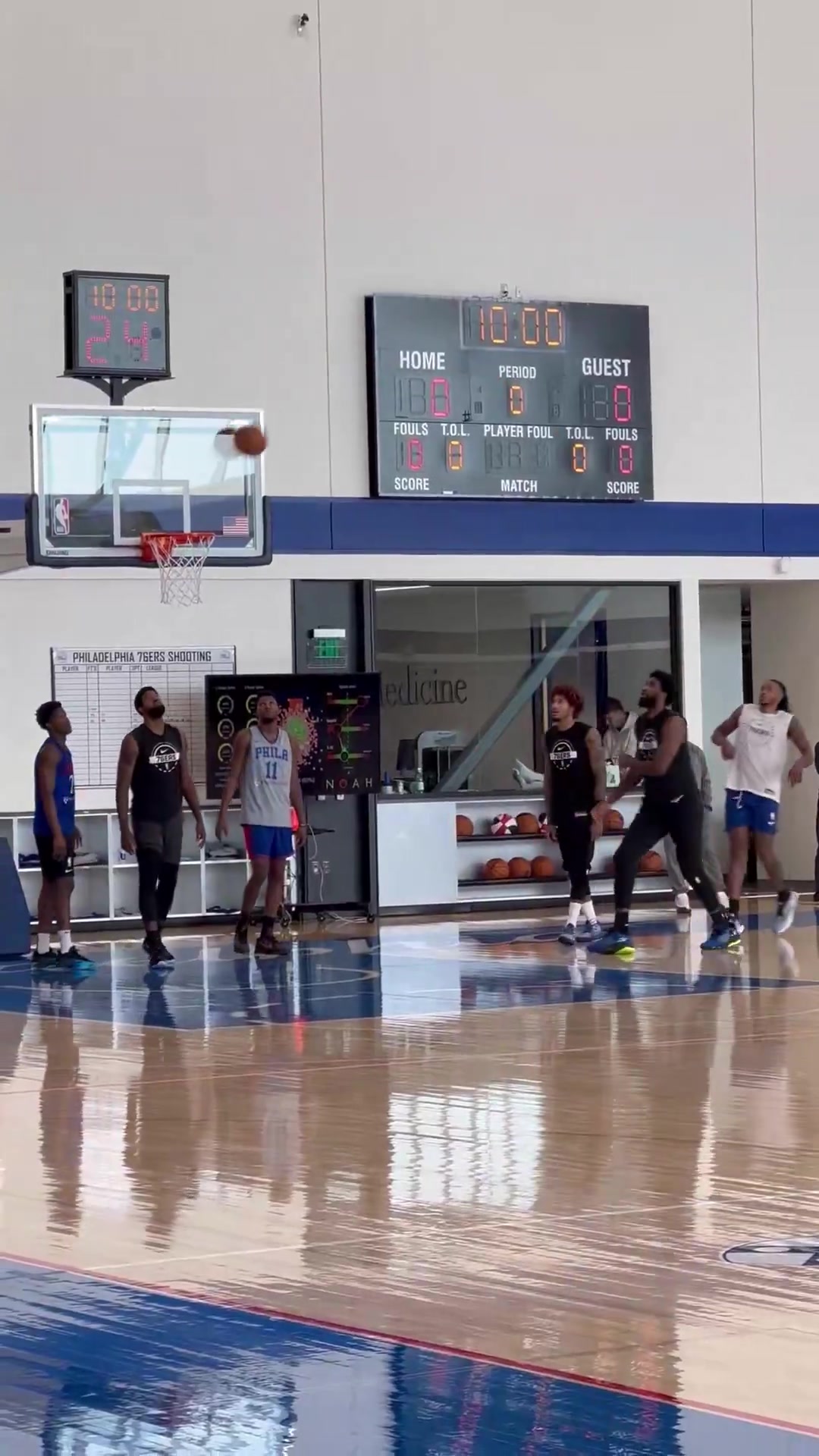 在今天的76人队内训练中,恩比德与队友轮流进行一对一的单挑