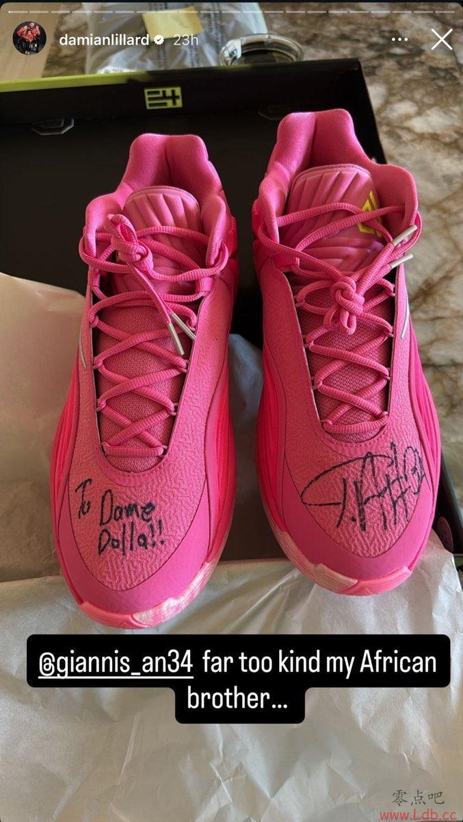 利拉德在个人社媒晒出了字母哥给他送来的球鞋礼物,利拉德写道:“@字母哥,太够意思,我的非洲兄弟