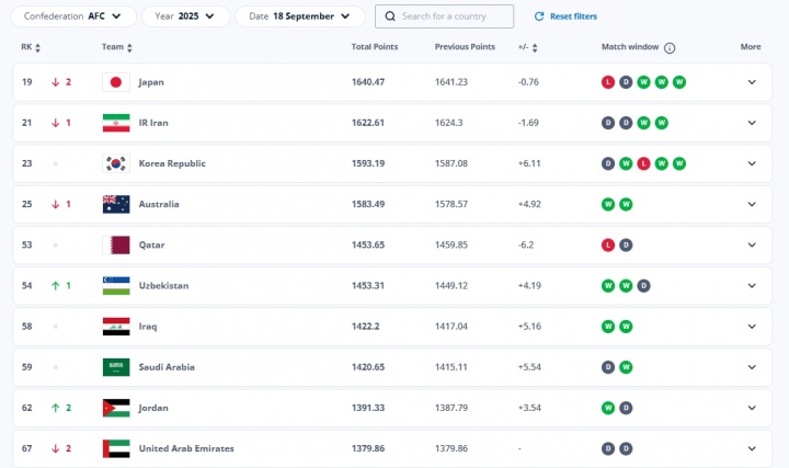 符合排名无意外!FIFA亚洲前十:8队直通世界杯,剩余2队踢附加赛