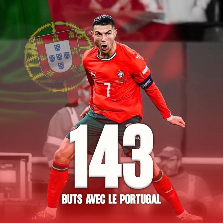 C罗国家队生涯225场打进143球,继续领跑国家队历史射手榜,领先第二梅西29球!