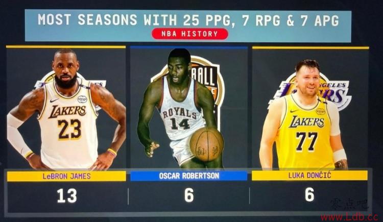 单赛季场均25+7+7场次:詹姆斯13次历史最多 东契奇大O历史第二