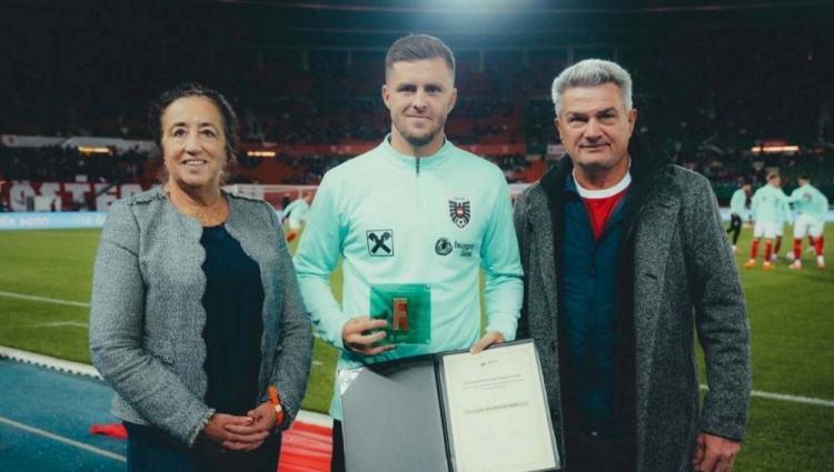 零点吧足球10月16日讯 莱比锡官网消息,克里斯托夫-鲍姆加特纳在新赛季伊始表现出色,已经打入两球并有一次助攻。周三,这位奥地利国脚从国家队归来时,手中还拿着一个特别的奖杯。不过,这一次吸引人们注意的并不是他的足球成就。鲍姆加特纳因社会贡献而获公平竞赛奖。