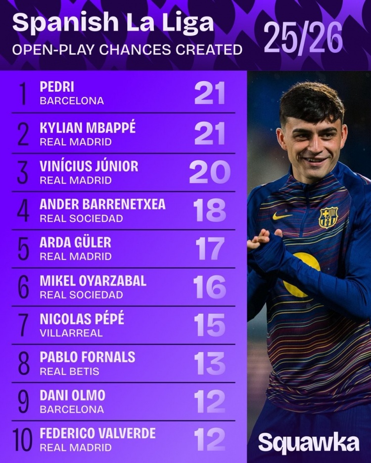 西甲本赛季运动战创造机会榜:佩德里、姆巴佩21次并列第一