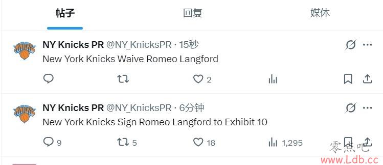 零点吧10月17日讯 尼克斯官方宣布,球队已经签下罗密欧-朗福德(Exhibit 10合同),6分钟后,他们又宣布裁掉了他。