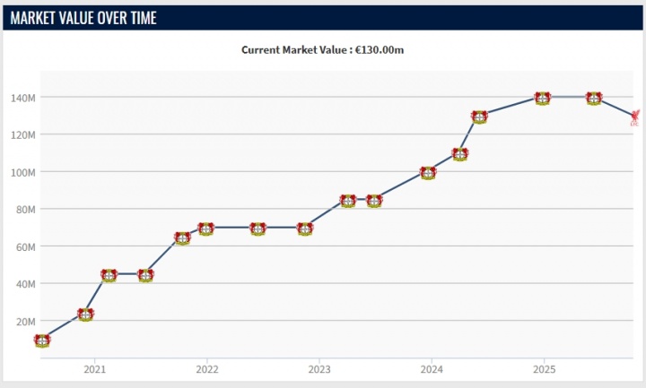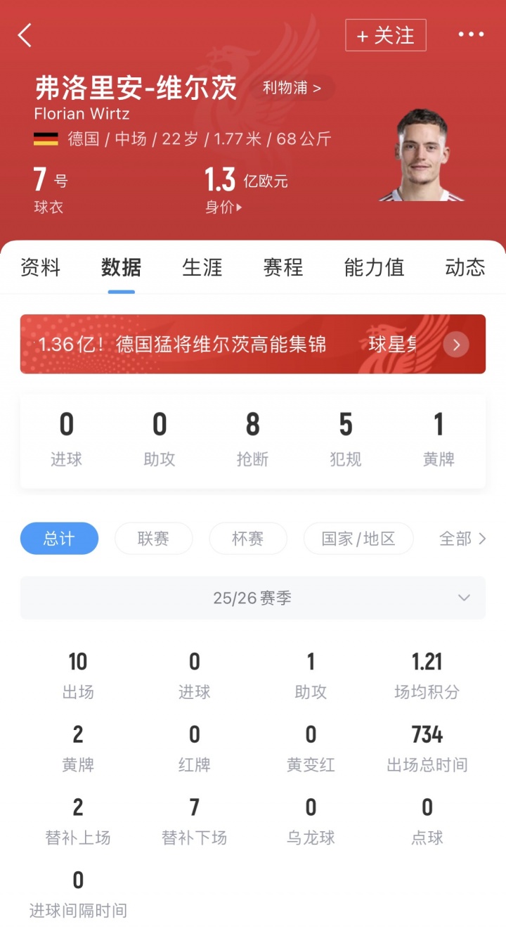 零点吧足球10月18日讯 德转昨日更新英超球员身价,今夏加盟利物浦的维尔茨身价下降1000万欧,从原来的1.4亿调整为1.3亿欧。