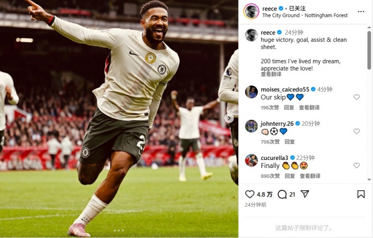 零点吧足球10月18日讯 今天,切尔西在英超3-0击败诺丁汉森林,里斯-詹姆斯赛后在Instagram发文,庆祝个人蓝军生涯200场里程碑。