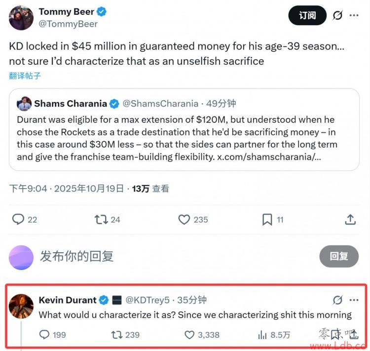 有网友转发了Shams的推特,写道:“KD在39岁那年都能稳稳拿到4500万美元… 这恐怕不能算是什么无私的牺牲吧。”