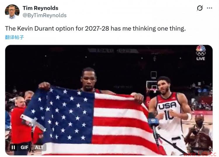 美记Tim Reynolds晒出杜兰特奥运会上手持美国国旗的表情包,写道:“杜兰特27-28的赛季球员选项让我在想这件事。”
