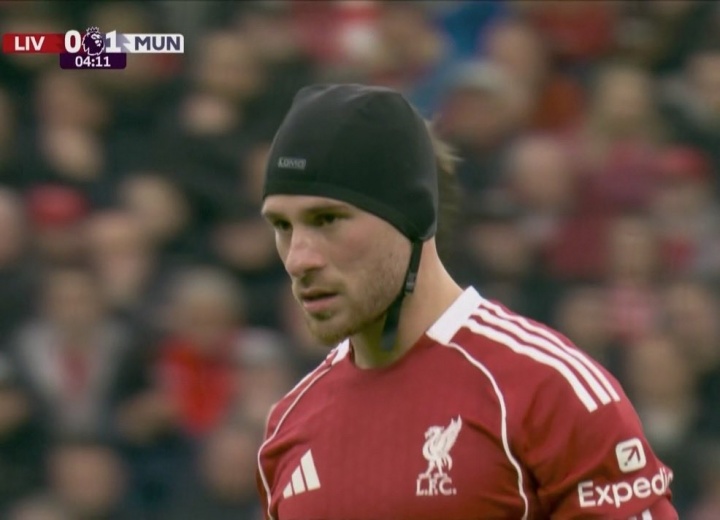 比赛刚开始姆伯莫破门,在进球前的争顶,范迪克争顶中肘击麦卡利斯特。之后麦卡接受治疗,头上戴上了帽子继续比赛。