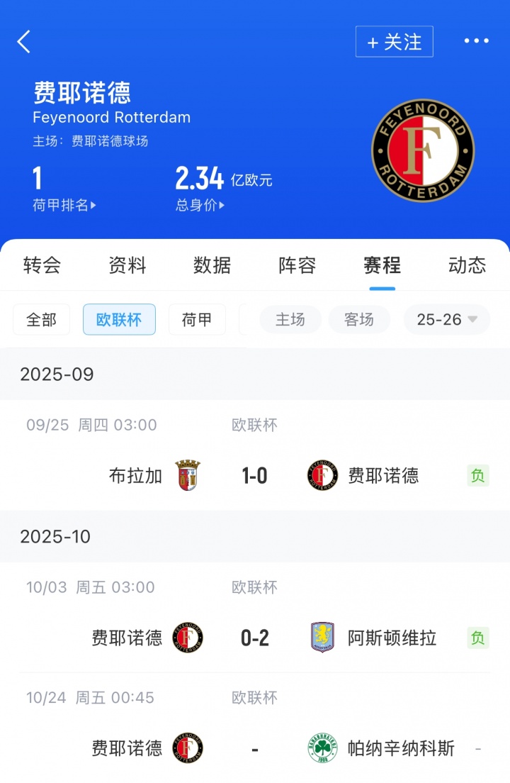 而在欧联赛场,费耶诺德遭遇了两连败,0-1输给葡超布拉加,0-2不敌阿斯顿维拉。欧战开局2场0进球,也是费耶诺德队史最差纪录。