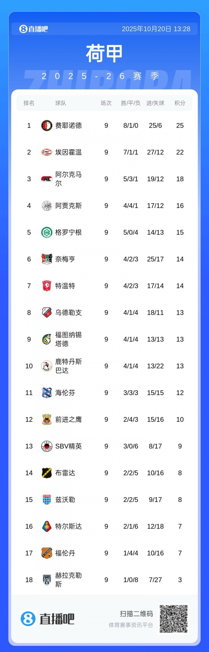 荷甲9轮过后,范佩西挂帅的费耶诺德8胜1平不败,进25球丢6球,积25分领跑荷甲。