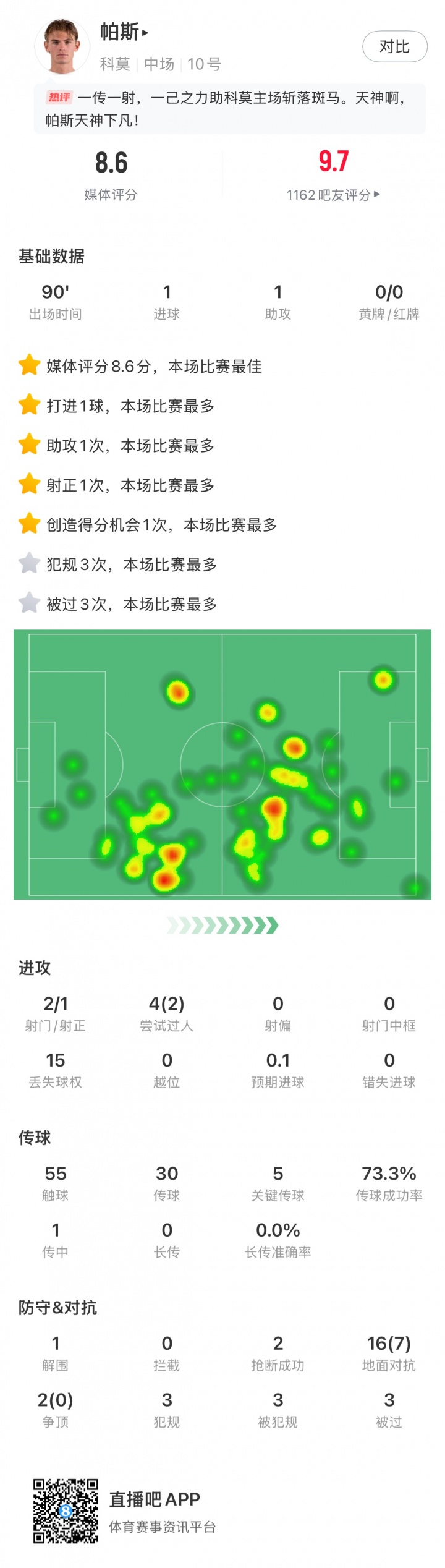 科莫1-1克雷莫内塞,帕斯12次地面对抗成功7次