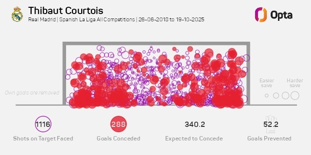 Opta指出,2018-2019赛季库尔图瓦加盟皇马以来,预期失球340.2粒,而去掉乌龙球的实际失球为288粒,这意味着库尔图瓦阻止了52.2粒失球,五大联赛门将同期最多。
