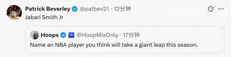 前NBA球员贝弗利回复道:“小贾巴里-史密斯。”