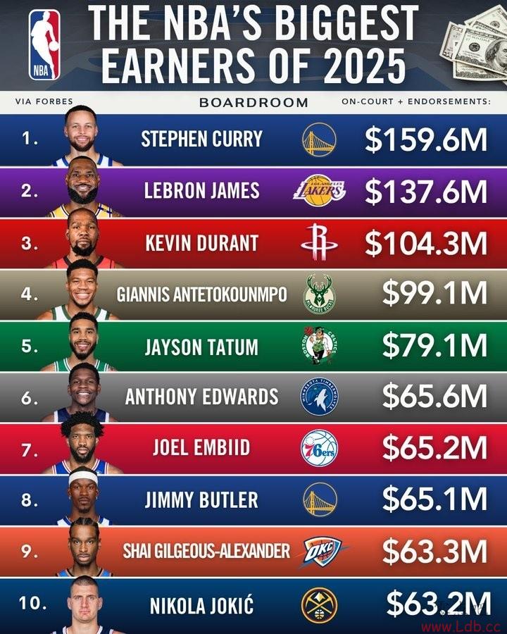 本年度球星收入排行:库里1.596亿居首 詹姆斯1.376亿居次 KD第三