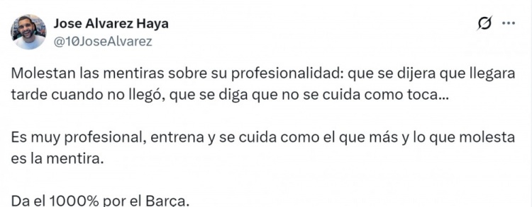 Jose Alvarez Haya社媒写道:“诋毁亚马尔职业态度的谣言令人恼火——他明明没有迟到,却被传迟到,还被说疏于自我管理。”