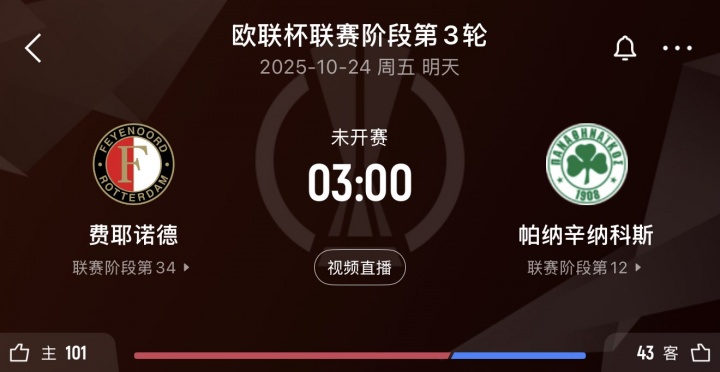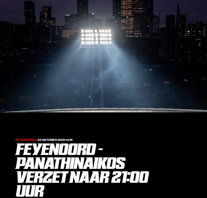 零点吧足球10月23日讯 官方消息,原定北京时间今晚22点30分进行的欧联杯,费耶诺德主场vs帕纳辛纳科斯的比赛因天气原因推迟。