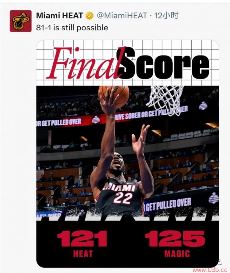 赛后热火官方晒出海报并写道:“81胜1负仍有可能。”
