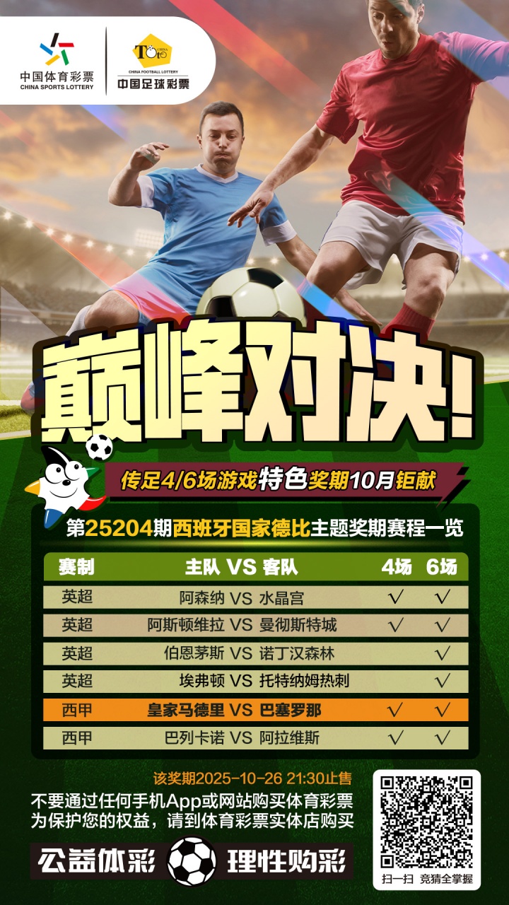 第25204期传足4/6场游戏特色奖期已经于2025年10月22日20:00开售,将于2025年10月26日21:30停售,并于10月27日开奖,其中阿森纳VS水晶宫、阿斯顿维拉VS曼彻斯特城、皇家马德里VS巴塞罗那和巴列卡诺VS阿拉维斯为4场进球游戏竞猜赛事。