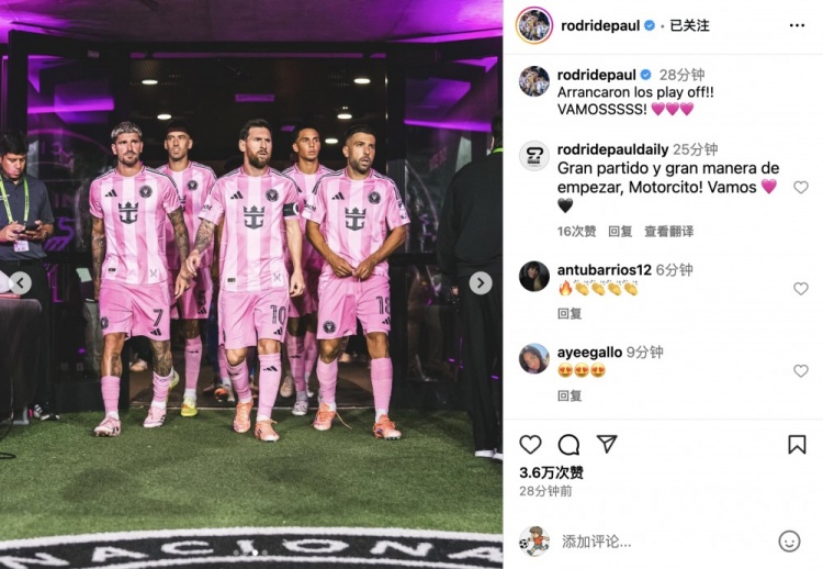 零点吧足球10月25日讯 美职联季后赛1/8决赛,迈阿密国际主场3比1击败纳什维尔。赛前,德保罗更新社媒庆祝球队胜利。