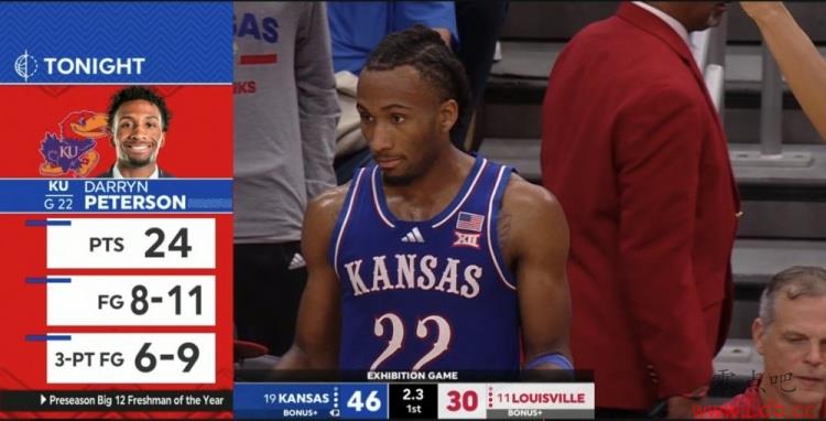 明年状元热门、堪萨斯大学球衣达林-彼得森表现出色,他上半场11中8(三分9中6),轰下24分。全场比赛他得到26分4篮板2助攻。