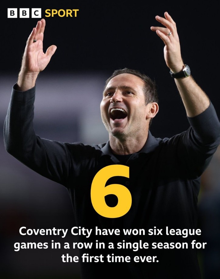 据统计,这也是考文垂队史首次在单一赛季取得联赛6连胜,兰帕德率领球队创造历史。