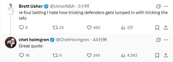 零点吧10月26日讯 今天,雷霆球员霍姆格伦在推特上点赞了一则关于造犯规的评论。