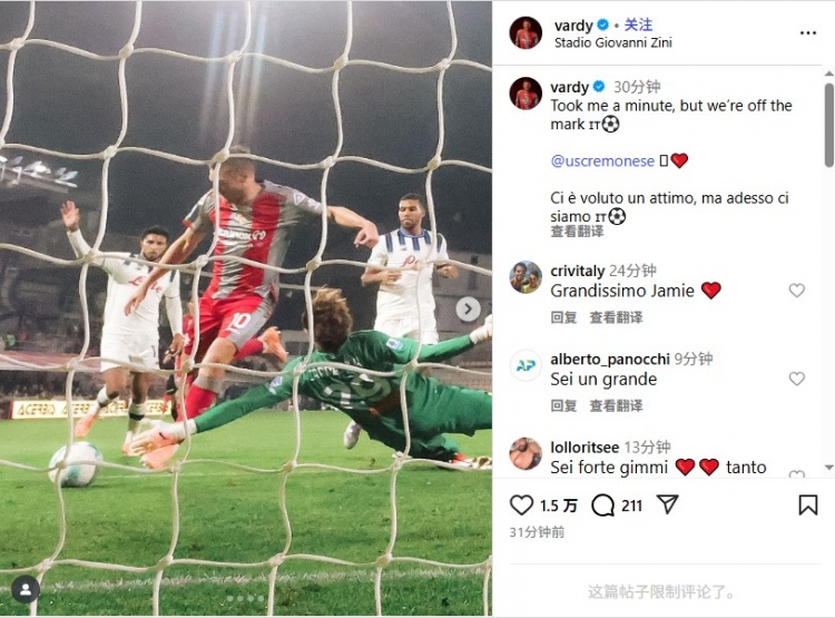 零点吧足球10月26日讯 瓦尔迪今天在Instagram发文,庆祝自己打入克雷莫内塞生涯首球。