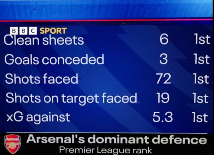 零点吧足球10月27日讯 据BBC统计,阿森纳本赛季多项防守数据英超居首。