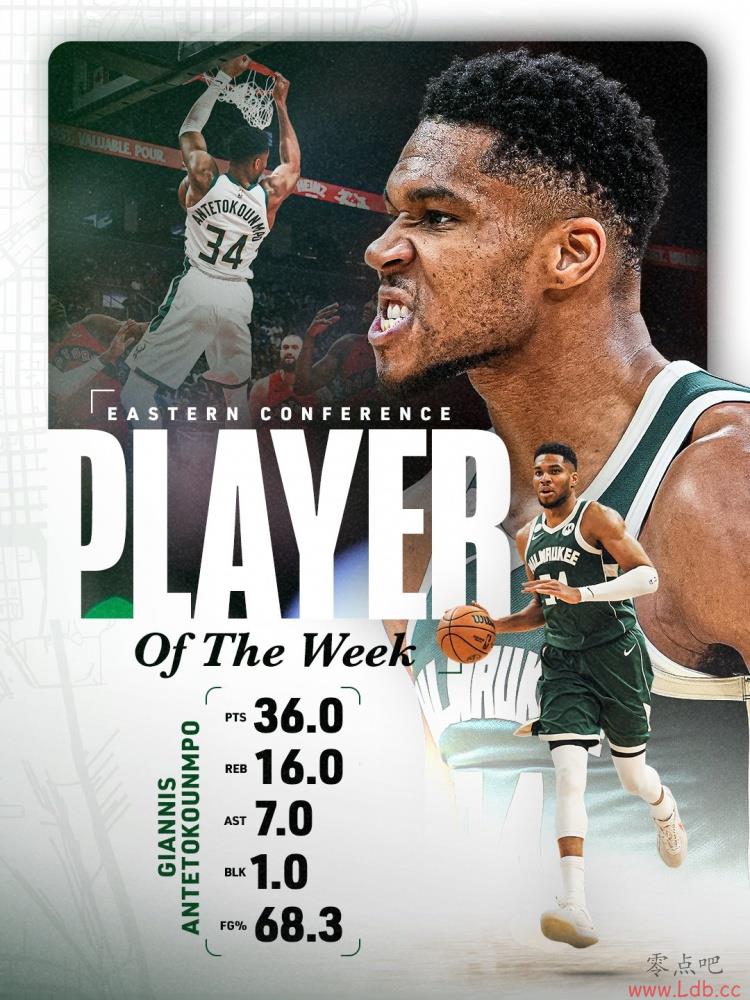 字母哥上周三场比赛(2胜1负)场均36分16篮板7助攻1封盖,投篮命中率高达68.3%