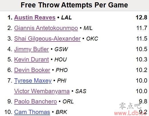 到目前为止,湖人球星里夫斯场均出手12.8次罚球居榜首,Top10详情如下: