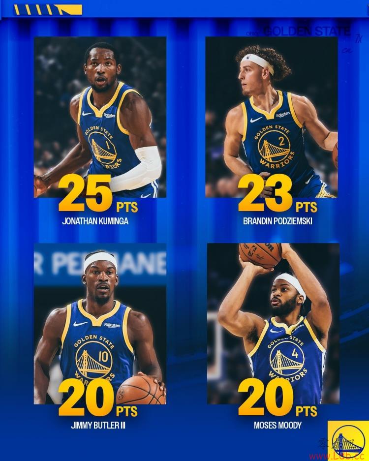 零点吧10月29日讯 勇士官方社媒更新动态,晒出了昨日四人得分20+的海报,并配文写道:“四面开花!昨晚勇士有四名球员得分20+。”