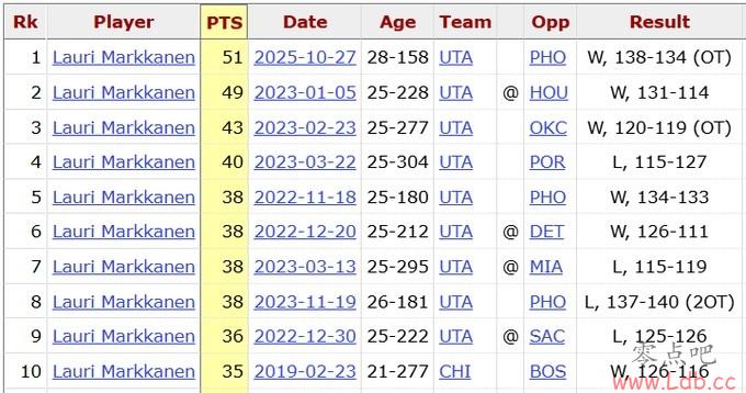 芬兰球员在NBA的单场得分榜单,马尔卡宁也是包揽前十。