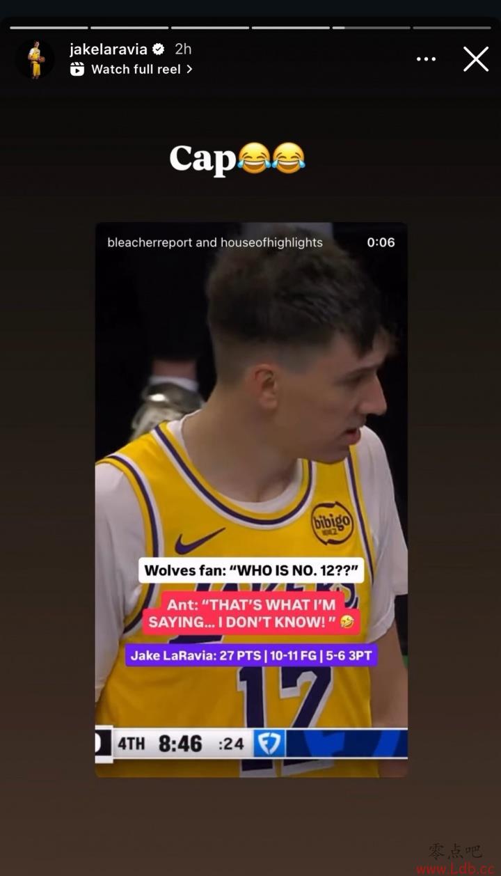 值得一提的是,湖人侧翼拉拉维亚(12号)赛后在Instagram上转发了相关片段(如下):“撒谎????。”