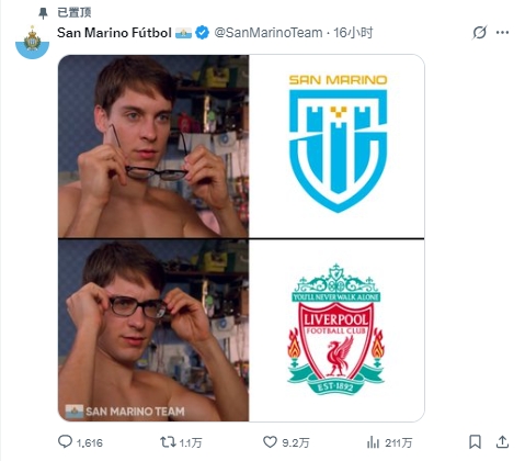 这引发了各界对利物浦的广泛批评。而FIFA目前排名倒数第一的圣马力诺也没有错过这波“天降的流量”,他们在官方社媒上发布了一张调侃利物浦和自己实力相当的梗图,又在评论区@了利物浦的官方账号,说:“你好,请和我们来踢一场。”