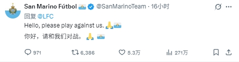 是懂流量的??FIFA倒一圣马力诺官推打趣利物浦:来跟我们踢一场