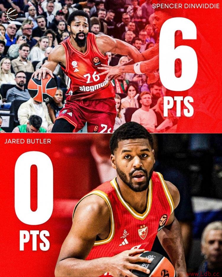 丁威迪在拜仁86-70击败博洛尼亚的比赛中,出场20分钟,7中1,拿到6分3助。而巴特勒则在红星99-92击败特拉维夫马卡比的比赛中,仅仅出场2分钟,主要数据全部为零不说,还有两次犯规。