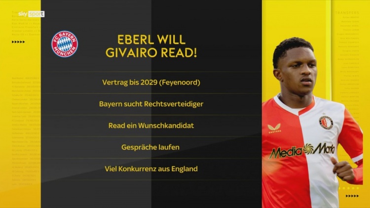 德国天空体育消息表示,拜仁正非常具体地关注吉瓦罗-雷德,这位年仅19岁的右后卫已经是荷甲费耶诺德的主力球员。由于表现出色,他在今年4月刚刚续约至2029年,不过依然有许多欧洲顶级俱乐部——尤其是来自英格兰的球队——对他非常感兴趣,拜仁也是其中之一。