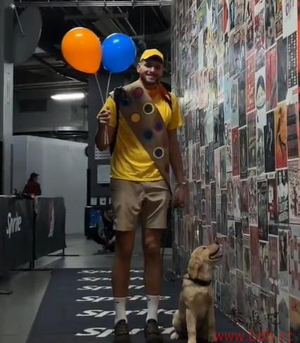 有点可爱!克林根打扮成《飞屋环游记》 中的罗素并牵着狗入场!