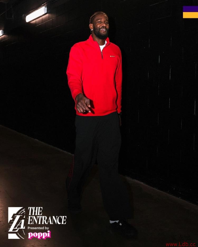 湖人众将入场穿搭:里夫斯穿球队周边 艾顿喜庆大红袍 拉拉满身花