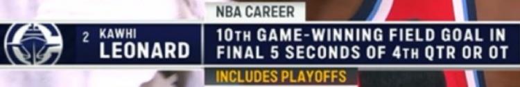 比赛最后时刻,莱昂纳德中投压哨绝杀;据统计,这是小卡NBA生涯(包括季后赛)第10次投中比赛仅剩余5秒内的制胜球(包括加时赛)。