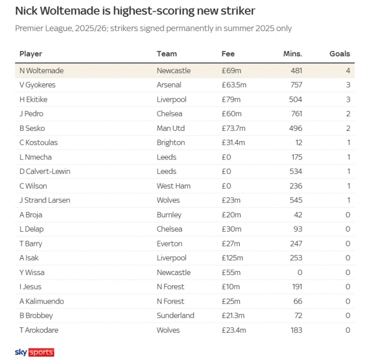 天空盘点英超新中锋:沃尔特马德4球 标王伊萨克0球 约克雷斯3球